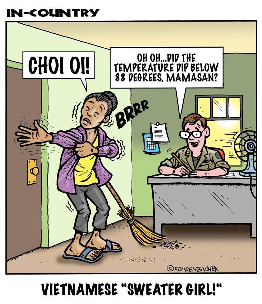 Phil enlisted in the Army in 1965 where you served for years in Vietnam.  He became a graphic designer and has worked for the state of Oregon for 26 years.  He retired in 2003 and started the Cartoon "In-Country".  The cartoons reflect his experiences during his tour of duty in South Vietnam.