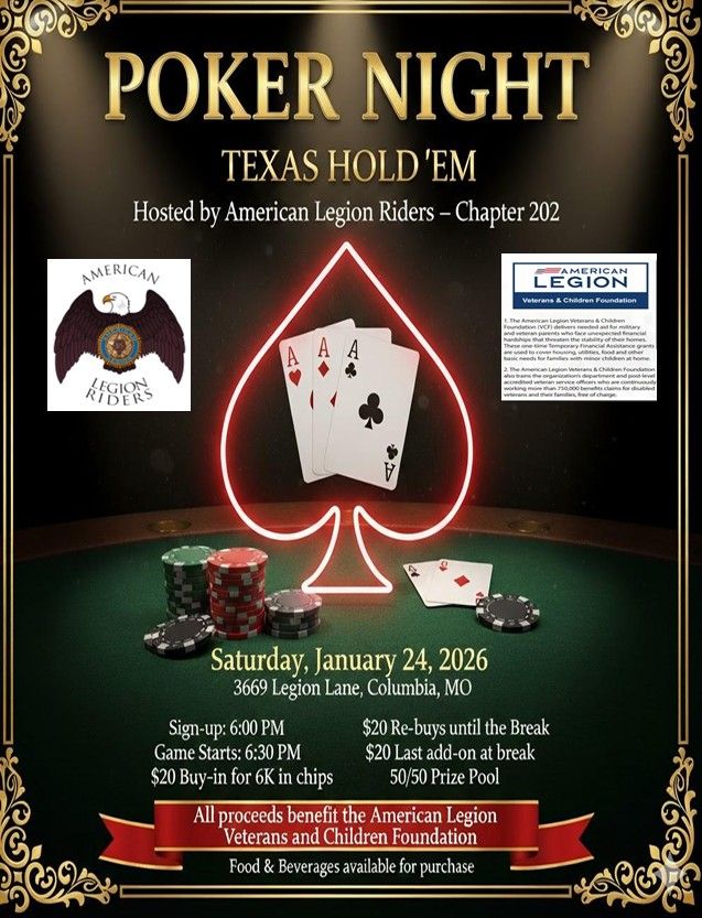 The American Legion Riders 202 have their meeting the second Tuesday of the month, January 13th, 2026, 6pm. January 24, 2026, the Legion Riders are having a Texas Hold'em Poker night and starting Tuesday January 20, 2026, through March 10, 2026, 6pm a friendly game of Cornhole.